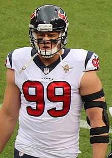 J.J. Wattは、アメリカ合衆国のプロフットボール選手であり、NFL(National Football League)のヒューストン・テキサンズでディフェンシブ・エンドとしてプレーしていました。身長196cm、体重131kgという大柄な体格を活かした堅牢なディフェンスプレーと、高いモチベーションとリーダーシップ力で知られています。彼は、数多くの賞を受賞しており、その中には、4回のNFL最優秀守備選手賞(Defensive Player of the Year)や、ウォルター・ペイトン人道賞(Walter Payton Man of the Year Award)も含まれています。また、チャリティー活動にも熱心に取り組んでおり、自身の財団を通じて、社会貢献活動にも力を入れています。J.J. Wattは、1989年3月22日にウィスコンシン州出身で、現在はアリゾナ・カージナルスでプレーしています。