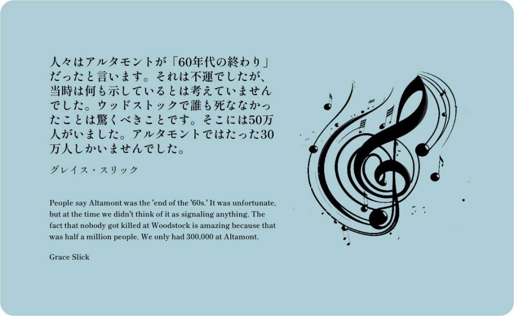 人々はアルタモントが「60年代の終わり」だったと言います。それは不運でしたが、当時は何も示しているとは考えていませんでした。ウッドストックで誰も死ななかったことは驚くべきことです。そこには50万人がいました。アルタモントではたった30万人しかいませんでした。 グレイス・スリック