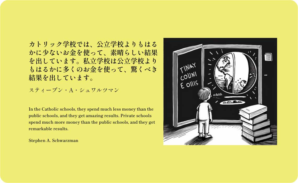 カトリック学校では、公立学校よりもはるかに少ないお金を使って、素晴らしい結果を出しています。私立学校は公立学校よりもはるかに多くのお金を使って、驚くべき結果を出しています。