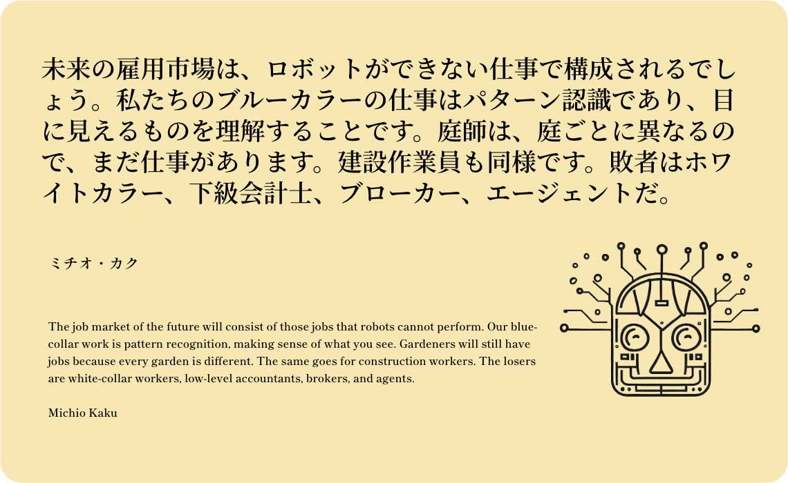 未来の雇用市場は、ロボットができない仕事で構成されるでしょう。私たちのブルーカラーの仕事はパターン認識であり、目に見えるものを理解することです。庭師は、庭ごとに異なるので、まだ仕事があります。建設作業員も同様です。敗者はホワイトカラー、下級会計士、ブローカー、エージェントだ。