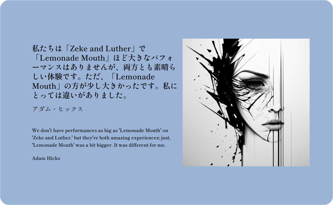 私たちは「Zeke and Luther」で「Lemonade Mouth」ほど大きなパフォーマンスはありませんが、両方とも素晴らしい体験です。ただ、「Lemonade Mouth」の方が少し大きかったです。私にとっては違いがありました。