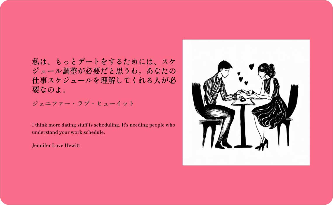 私は、もっとデートをするためには、スケジュール調整が必要だと思うわ。あなたの仕事スケジュールを理解してくれる人が必要なのよ。