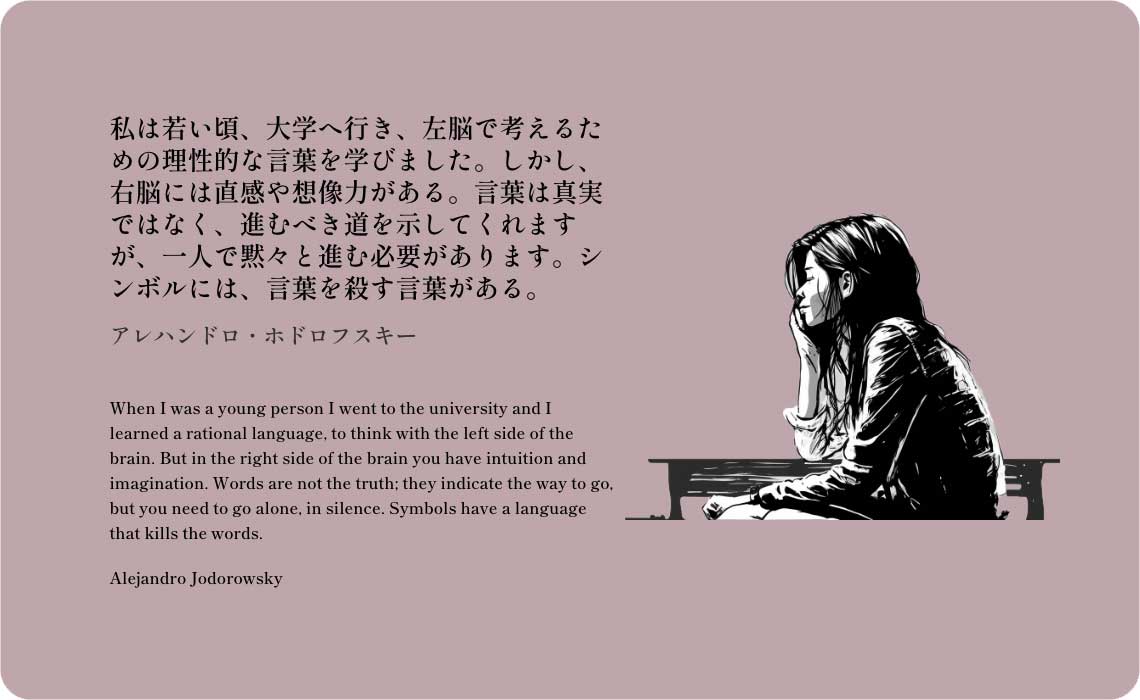 When I was a young person I went to the university and I learned a rational language, to think with the left side of the brain. But in the right side of the brain you have intuition and imagination. Words are not the truth; they indicate the way to go, but you need to go alone, in silence. Symbols have a language that kills the words.