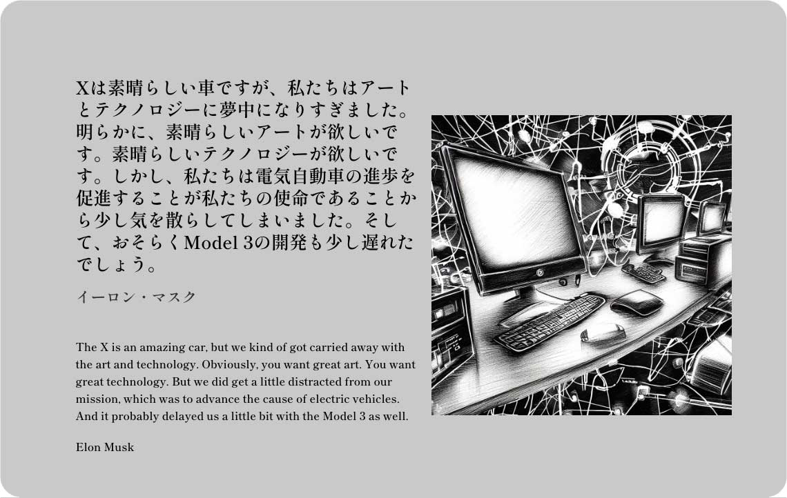 Xは素晴らしい車ですが、私たちはアートとテクノロジーに夢中になりすぎました。明らかに、素晴らしいアートが欲しいです。素晴らしいテクノロジーが欲しいです。しかし、私たちは電気自動車の進歩を促進することが私たちの使命であることから少し気を散らしてしまいました。そして、おそらくModel 3の開発も少し遅れたでしょう。