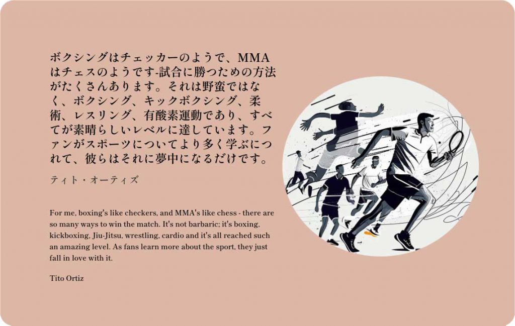 ボクシングはチェッカーのようで、MMAはチェスのようです-試合に勝つための方法がたくさんあります。それは野蛮ではなく、ボクシング、キックボクシング、柔術、レスリング、有酸素運動であり、すべてが素晴らしいレベルに達しています。ファンがスポーツについてより多く学ぶにつれて、彼らはそれに夢中になるだけです。 Add Your Heading Text Here