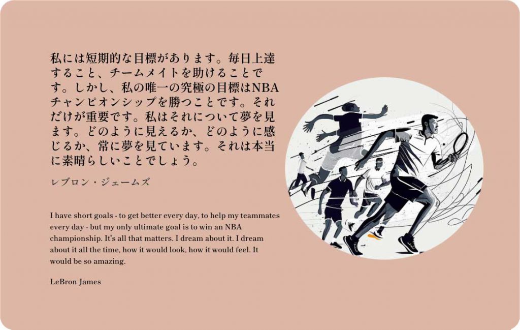 私には短期的な目標があります。毎日上達すること、チームメイトを助けることです。しかし、私の唯一の究極の目標はNBAチャンピオンシップを勝つことです。それだけが重要です。私はそれについて夢を見ます。どのように見えるか、どのように感じるか、常に夢を見ています。それは本当に素晴らしいことでしょう。 Add Your Heading Text Here